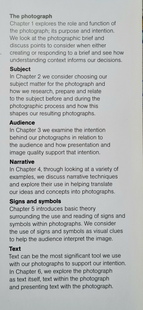 This book is styled and structure as a classroom textbook and covers the crucial role of context and narrative in visual imagery. I must admit that before I read this book, I had a very oversimplified and vague understanding of ‘context’ and ‘narrative’ in photography. This book helped me understand and appreciate the most basic as well as nuanced aspects of ‘context’ and ‘narrative’ in a photograph. While I have read this book once, I do feel the need to re-read many sections of this book to fully grasp its content, and apply them to my day-to-day photography. A fair amount of its content is too basic yet necessary to make it comprehensive. The book is overall an excellent resource for budding photographers exploring these ideas for the first time, as well as experienced photographers seeking a refresher and chance to develop great body of work. What makes this book a must-read for all photographers is the amount of illustrations and apt references of the (photography) projects used in this book to explain the concepts and ideas. The book is divided into six chapters, namely- The Photograph, Subject, Audience, Narrative, Signs and Symbols and Text. Each chapter begins with a very well-written introduction giving a sense of what to expect in that chapter and ends with appropriate ‘Case Study’ to illustrate the point; ‘Exercises’ for you to practice the lessons, and a crisp ‘Summary’ to refresh what you learnt. I would strongly recommend you to read and re-read this book time and again, in order to question yourself why you are photographing at the first place (not writing about it or painting it) and if you have a clear answer then, consider what is your intention; what do you want to say.