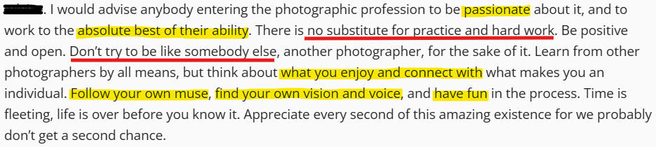 Personal Style: Explore styles early, but when you find your unique voice, stay consistent to let your identity mature, rather than imitating others. Be aware of the industry, but don’t compromise your style or vision just to stay current.