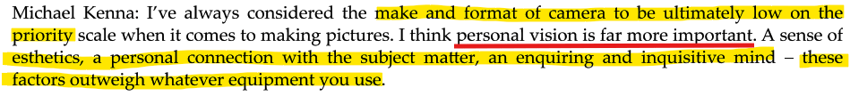 Digital Manipulation: Kenna is not a big fan of digital manipulation—He feel it weakens photography’s core strength: its deep connection to reality, which sets it apart from other visual arts like painting or sculpture.