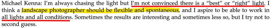 Talking to the Land: To Kenna, photographing landscapes is like “talking to the land” and asking for permission. It shows his humility, presence, and deep respect—he sees nature not as something separate, but as something we are deeply connected to.