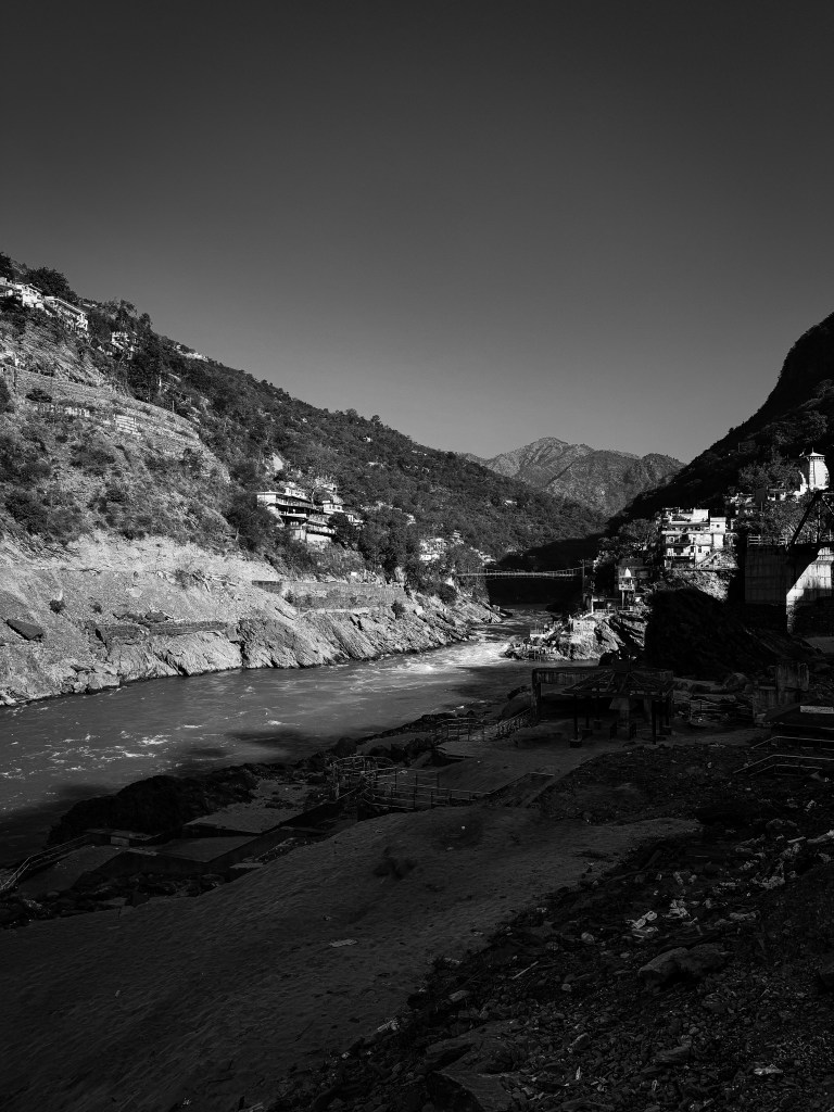 For much of the year, you can watch the meeting happen in real time. The Bhagirathi arrives darker, more intense, like a thought fully formed. The Alaknanda approaches lighter, carrying silt and memory from distant glaciers. They travel side by side for a brief stretch, distinct yet inseparable, before surrendering to a shared identity.
