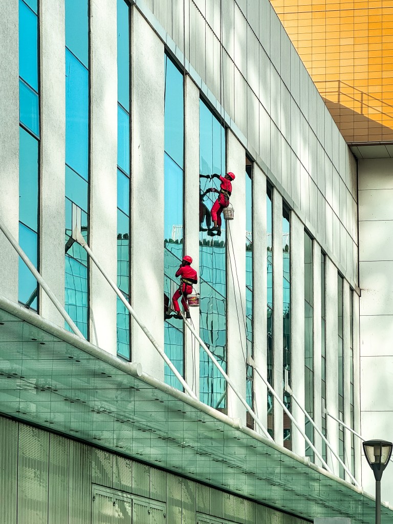 Between Glass and Gravity examines the quiet labour of glass-cleaning workers in red uniforms, suspended high above the street. Through reflections, repetition, and scale, the series foregrounds dignity, risk, and invisibility—revealing human presence etched onto the city’s surface, where work unfolds between transparency and gravity, order and vulnerability.